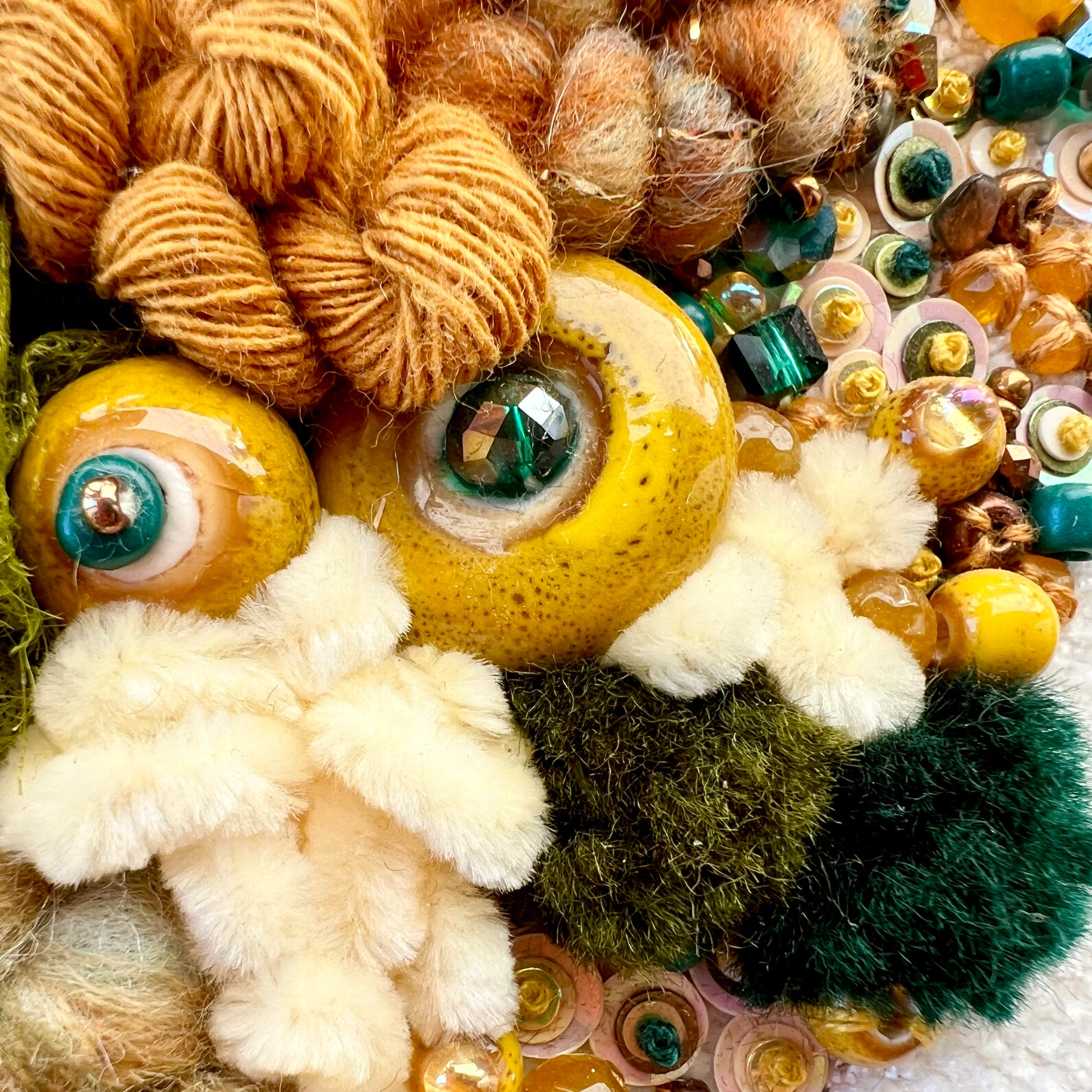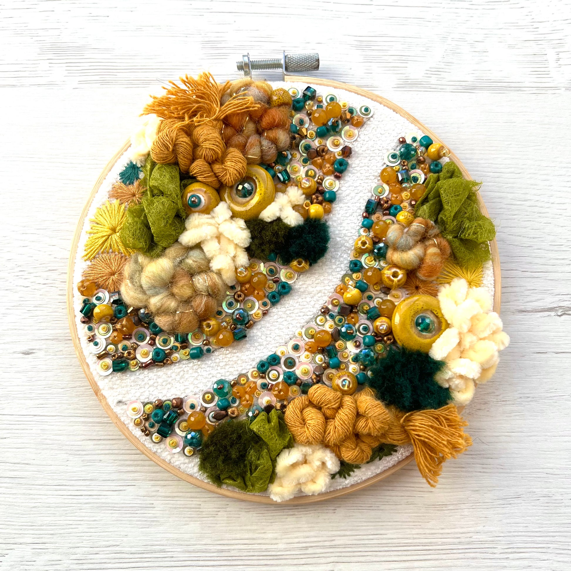 Each hoop is individually handcrafted by the artist using textile techniques, yarns, fabric, and beads. No two pieces are ever the same.