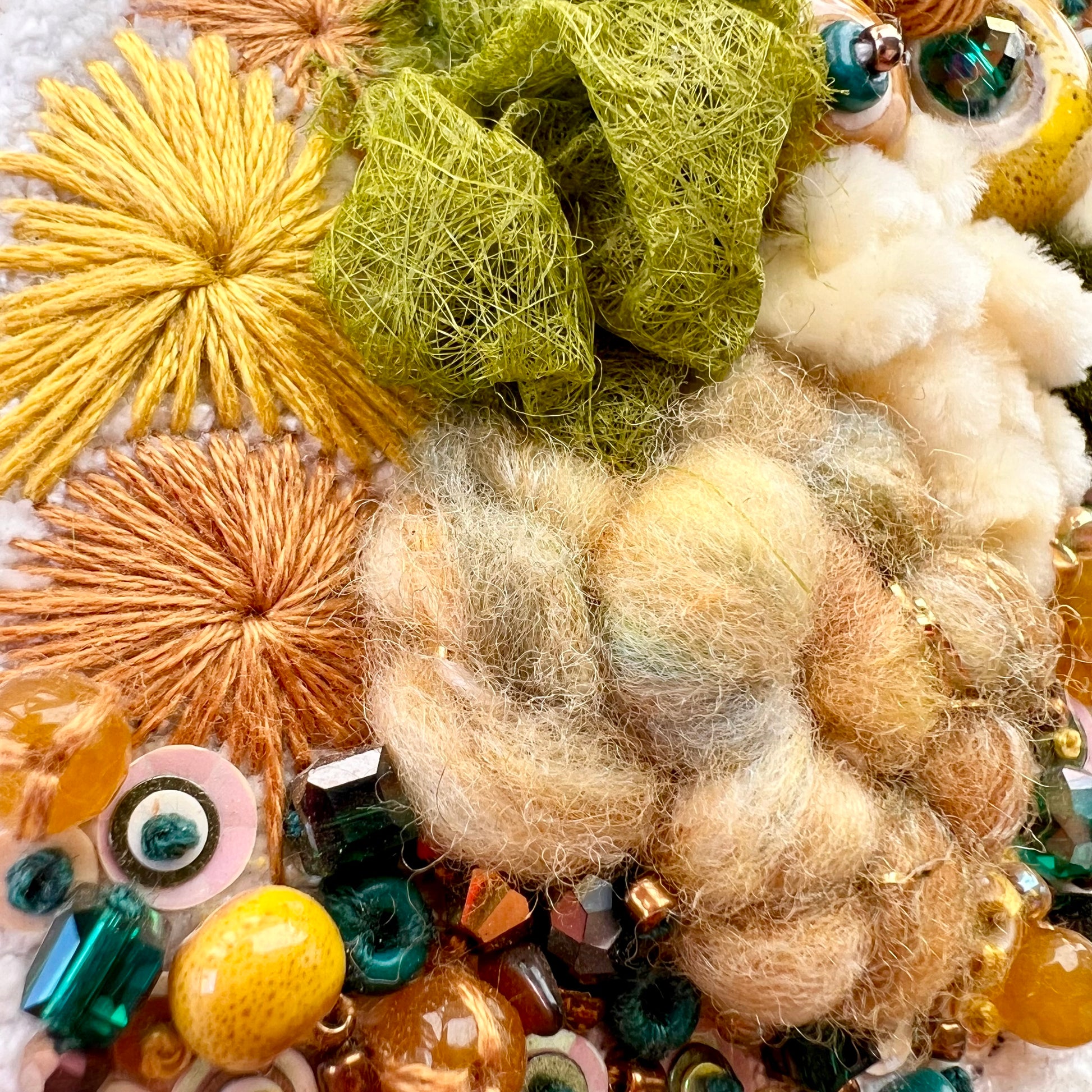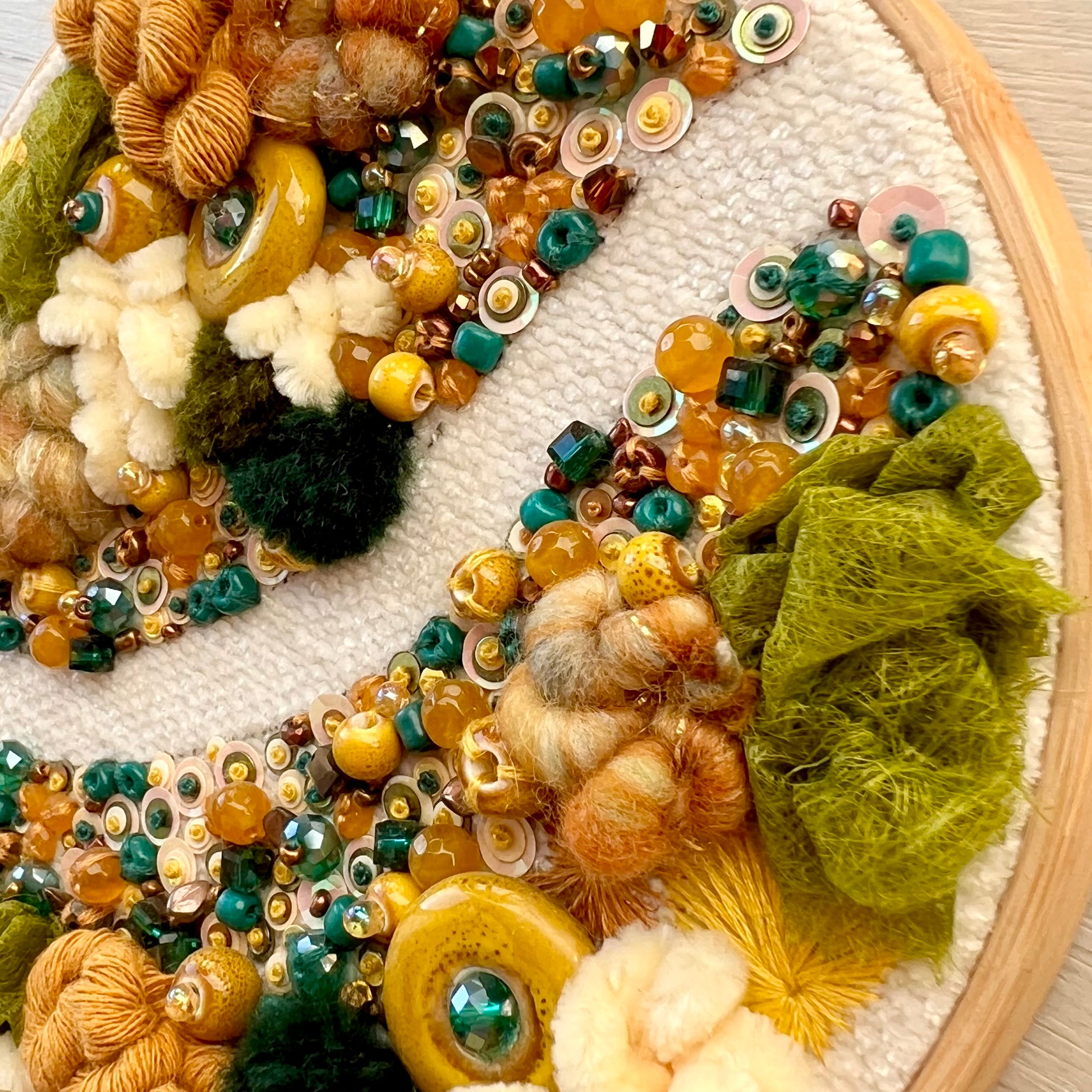 Made with recycled fabric at the background, and because of the texture that has I decided not to embroider the path. Has some fun details like some swirls made with hand spun yarn, some detailed green paper made out of cotton fibers, and a few ceramic beads mixed with some crystal beads and sequins. This embroidery hoop measures 15cm in diameter.