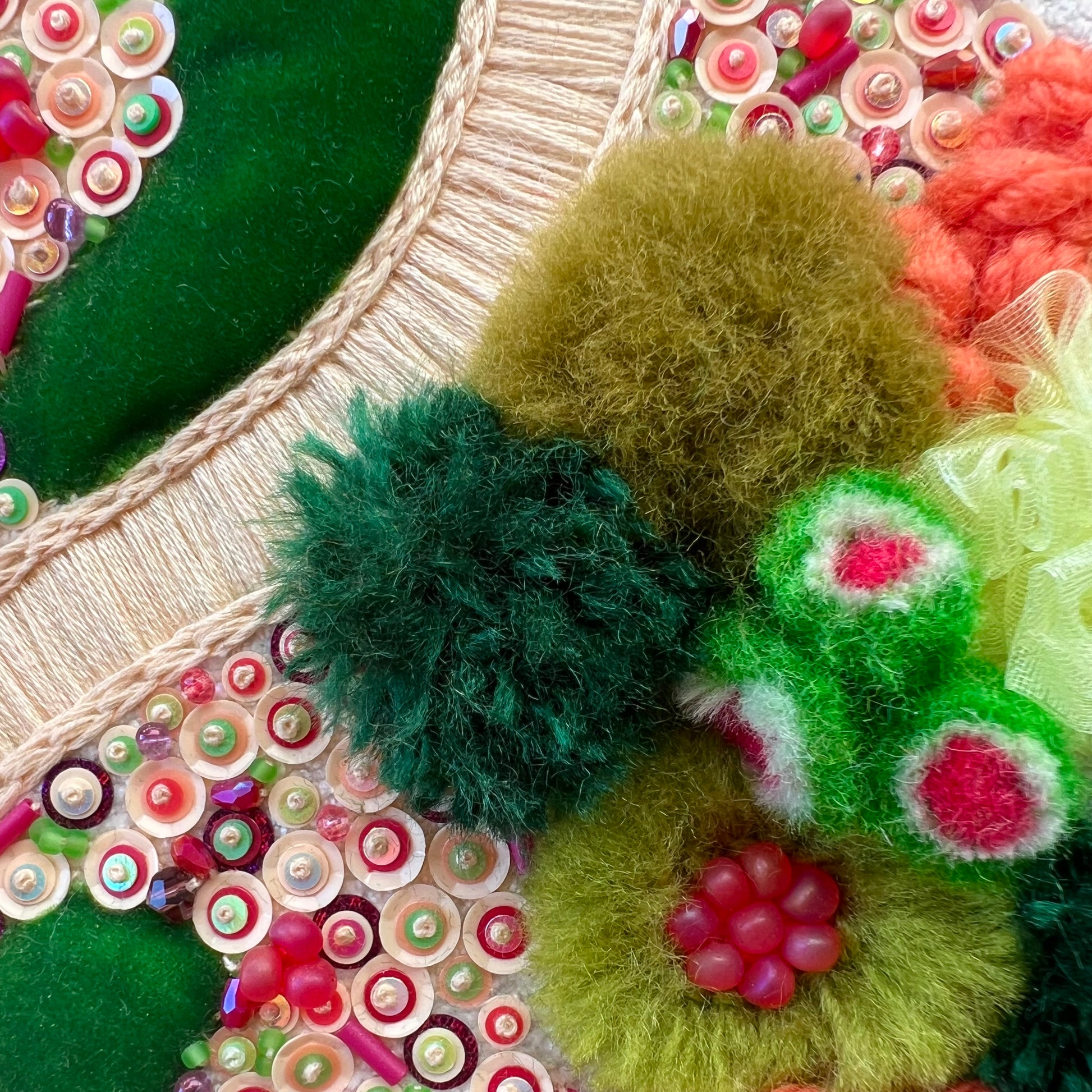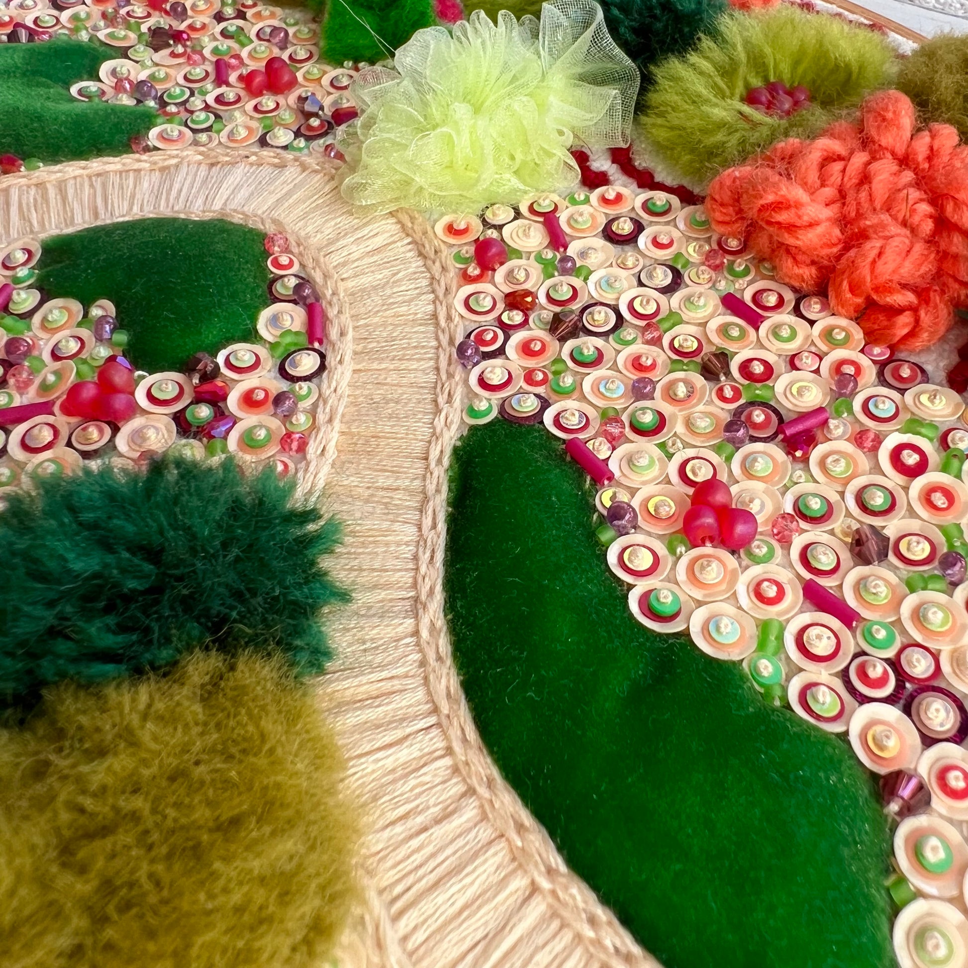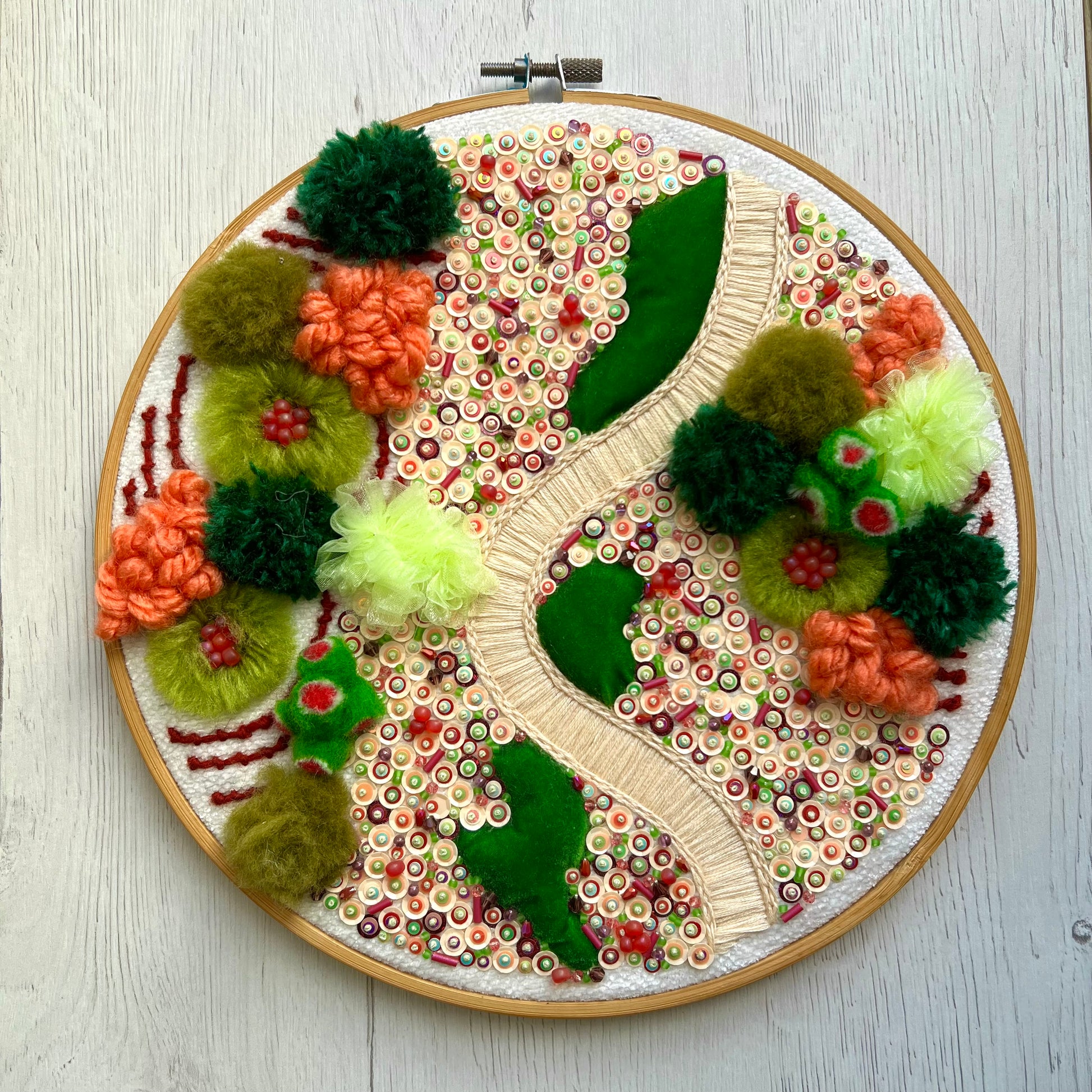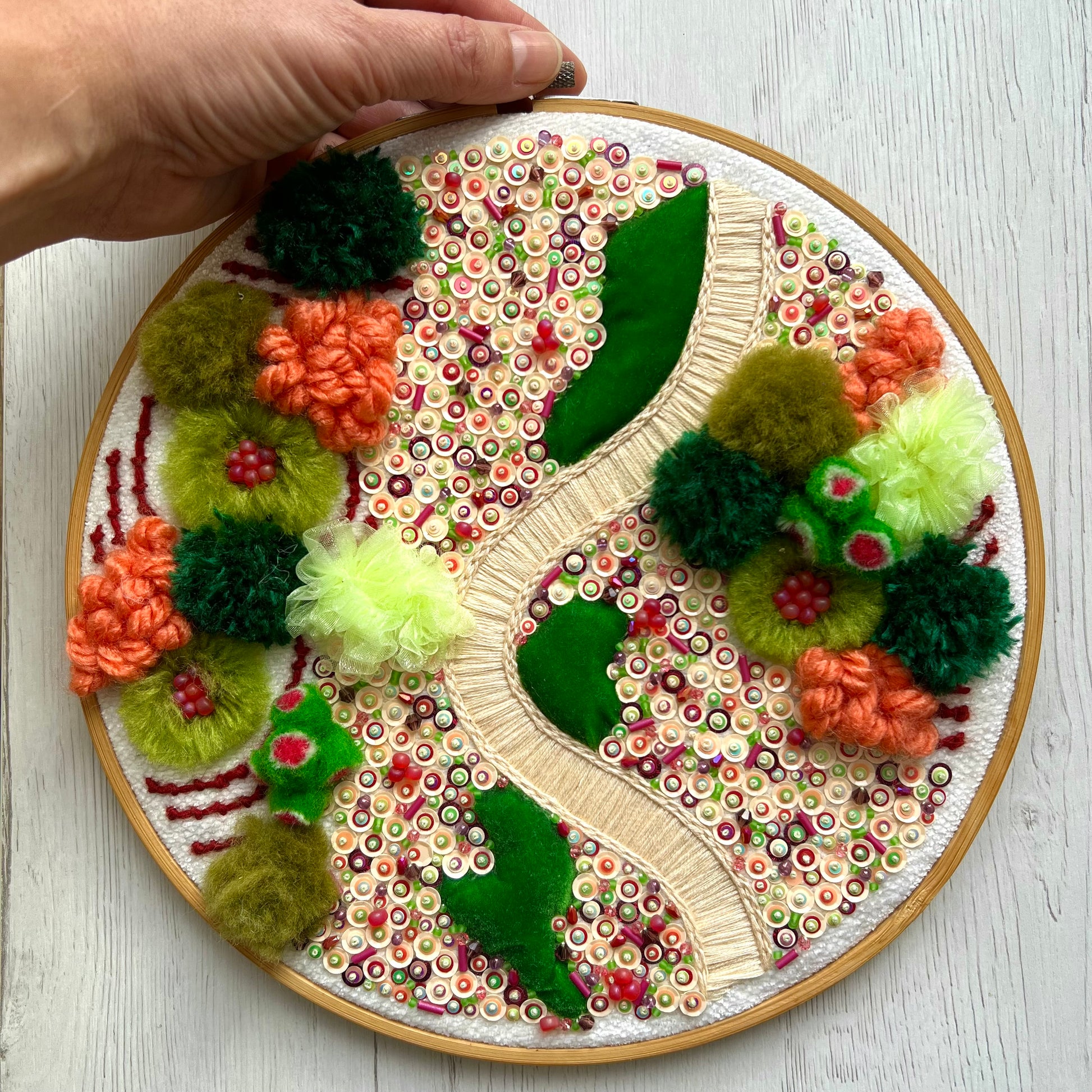 Each hoop is individually handcrafted by the artist using textile techniques, yarns, fabric, and beads. No two pieces are ever the same.