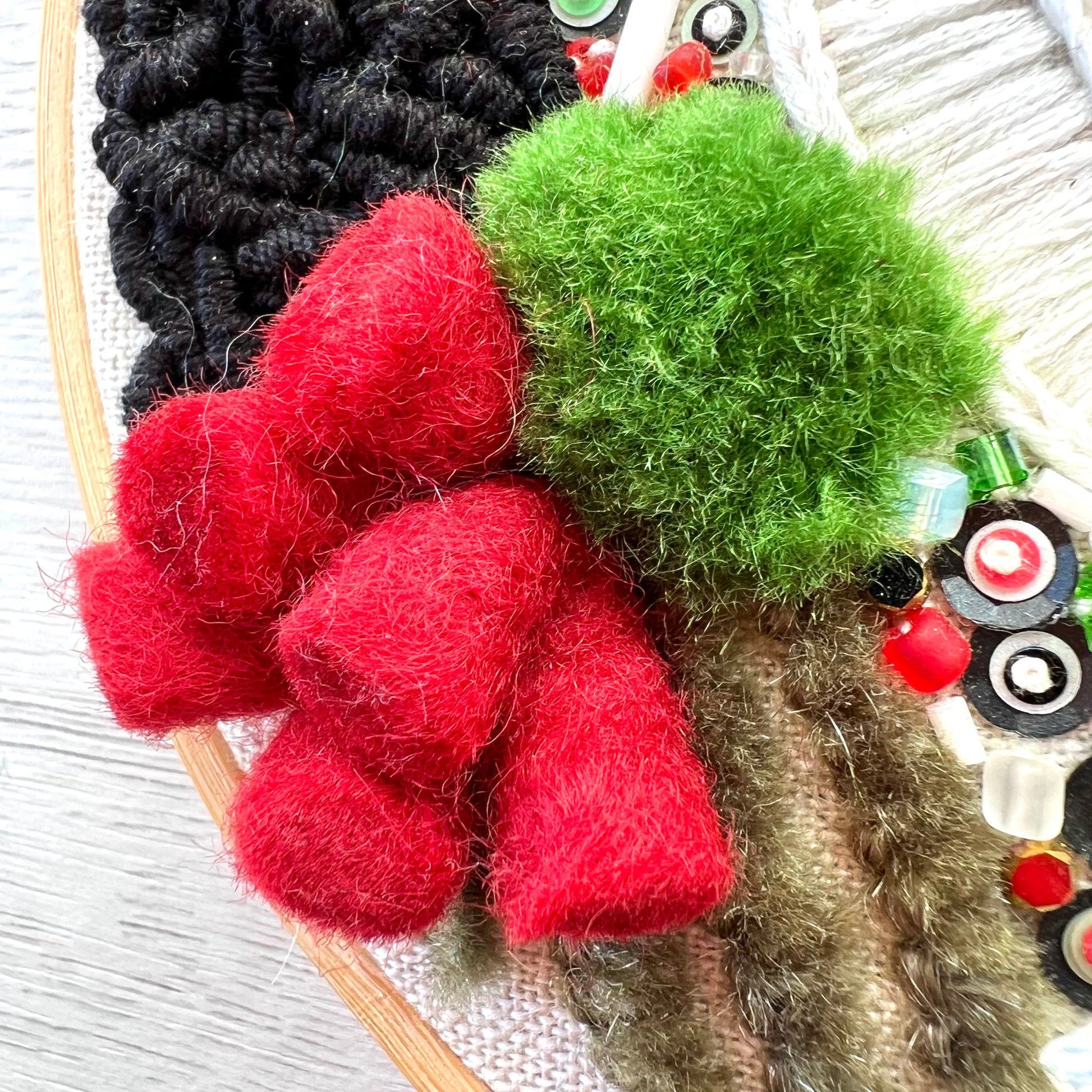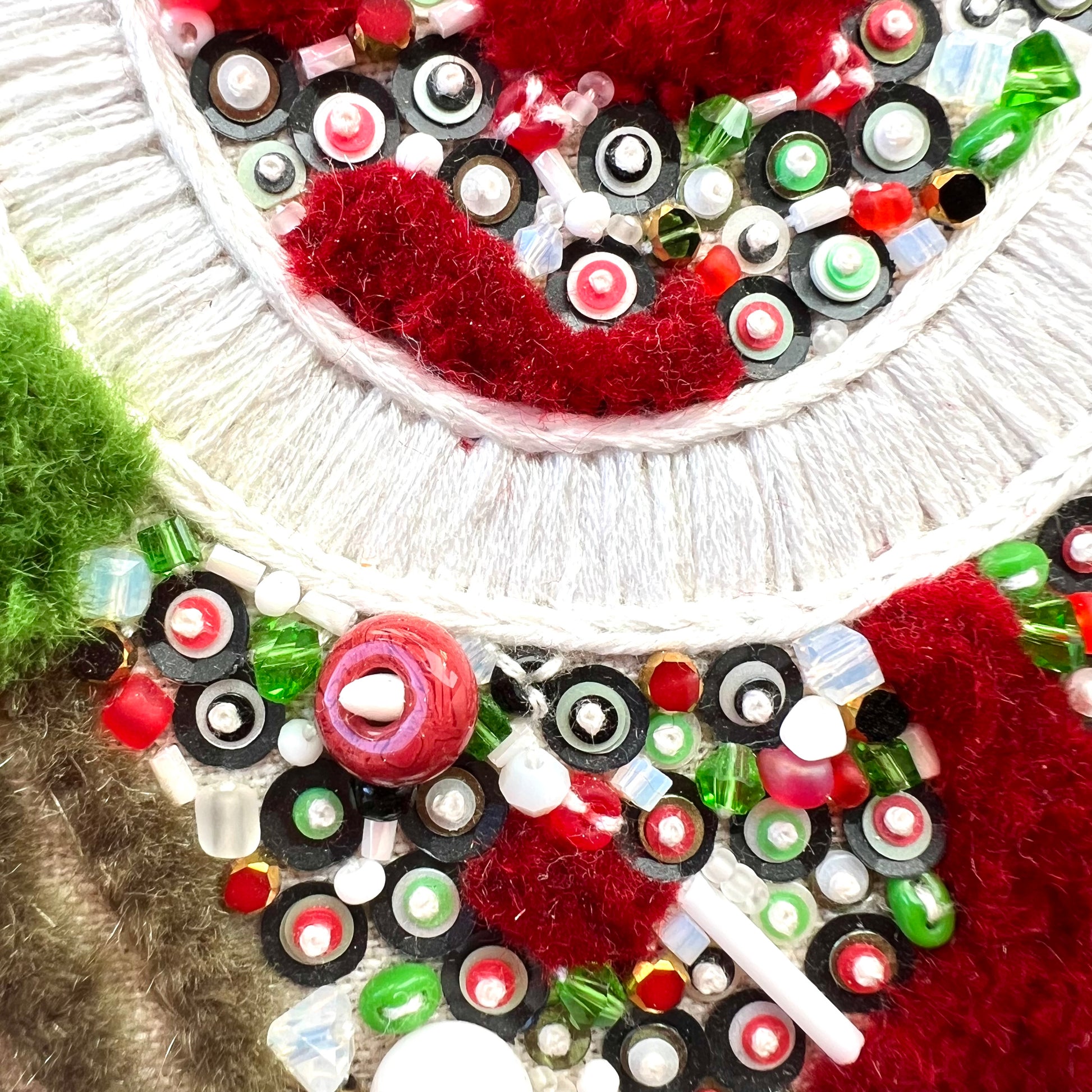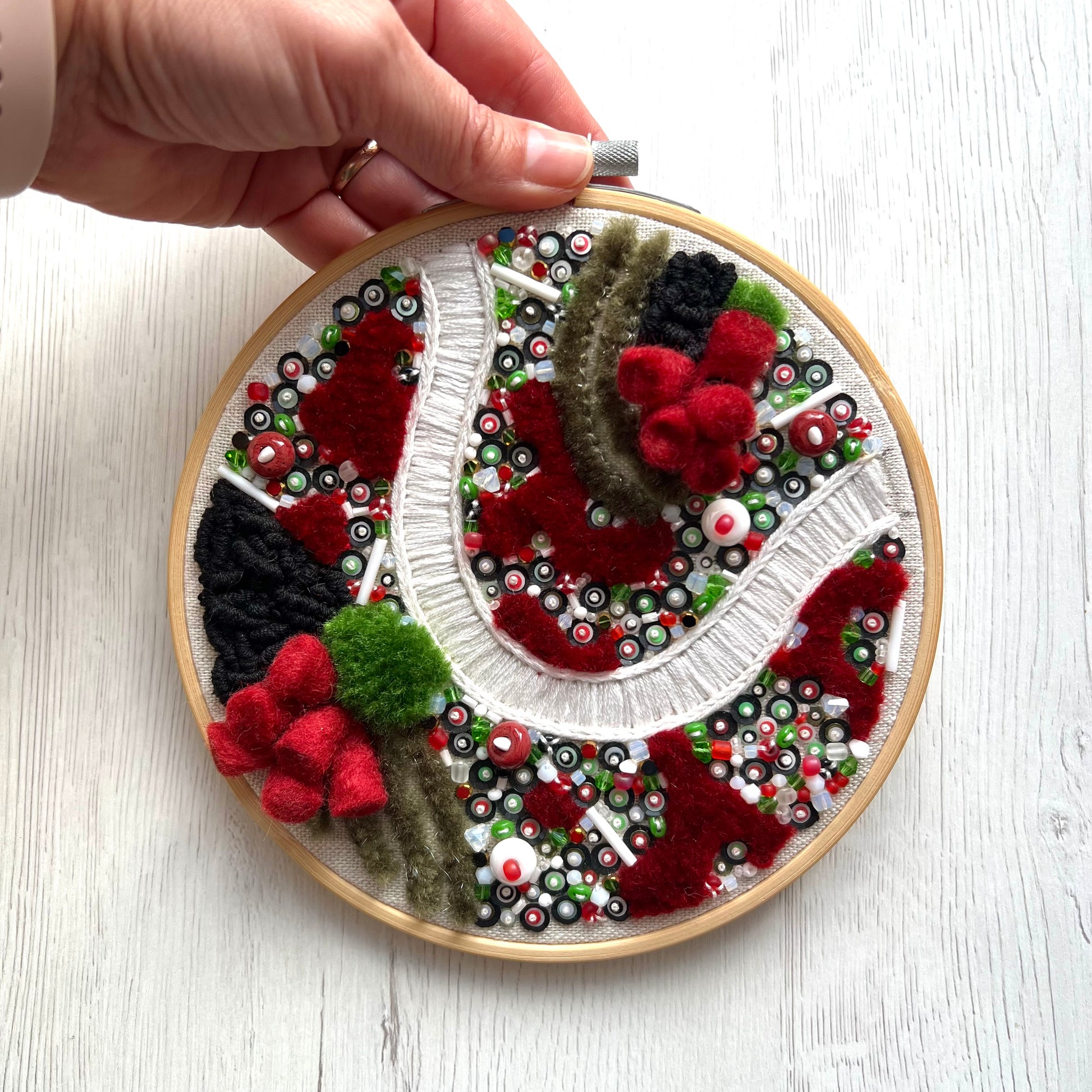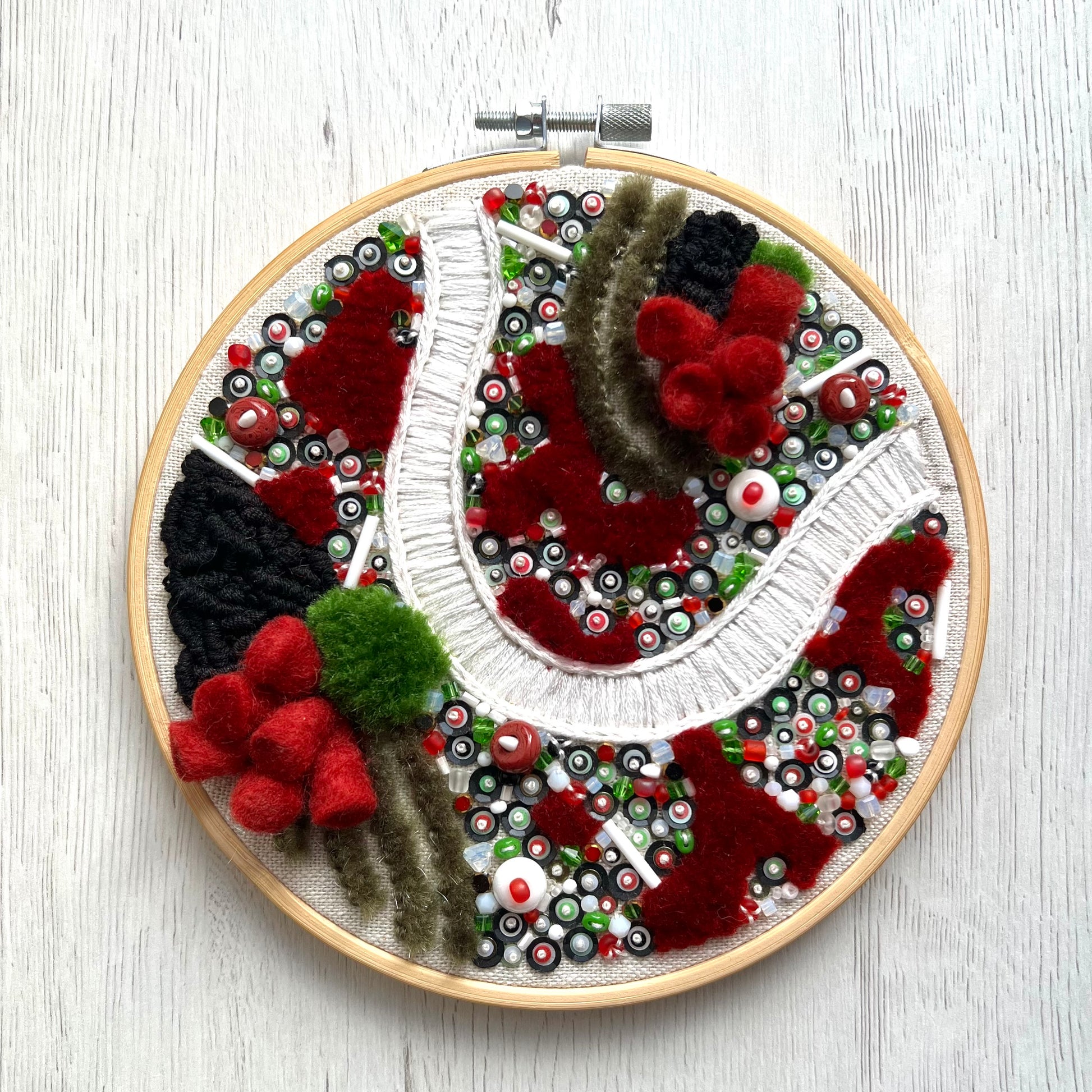 Each hoop is individually handcrafted by the artist using textile techniques, yarns, fabric, and beads. No two pieces are ever the same.